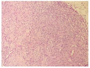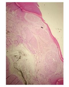 Figura 5.- Ligero infiltrado inflamatorio linfocitario perilesional y vasos linfáticos dilatados.