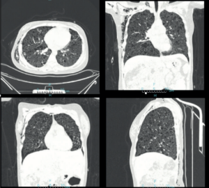 Figura 4.- La reconstrucción tridimensional muestra la presencia de múltiples lesiones quísticas distribuidas en los dos pulmones.