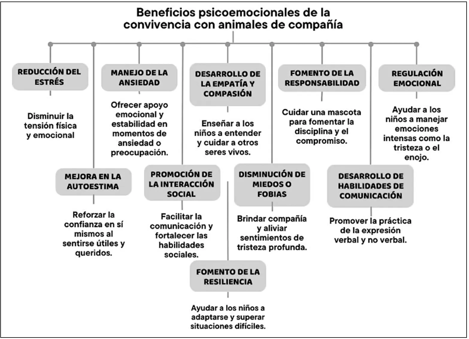 Los animales de compañía son una fuente de consuelo en momentos difíciles, pues ellos favorecen la superación de sentimientos de depresión, tristeza y desesperanza, al mismo tiempo que fortalecen la autoestima y la resiliencia en situaciones adversas. También actúan como catalizadores para mejorar la interacción social y desarrollar habilidades de comunicación, especialmente en niños con dificultades para relacionarse. Todo esto se detalla de una manera más adecuada en la siguiente tabla: