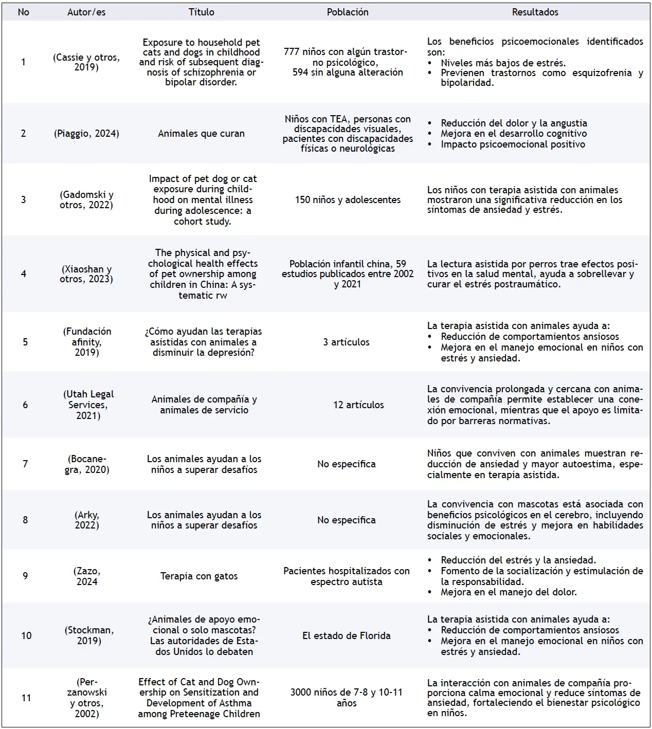 - Existe una sólida base científica, particularmente cualitativa, que respalda la convivencia con animales de compañía como un recurso efectivo para promover el bienestar psicoemocional en la infancia. En esta investigación, no se priorizaron los estudios cuantitativos, considerando que existe una variedad de ellos que fortalecen y complementan estos hallazgos.