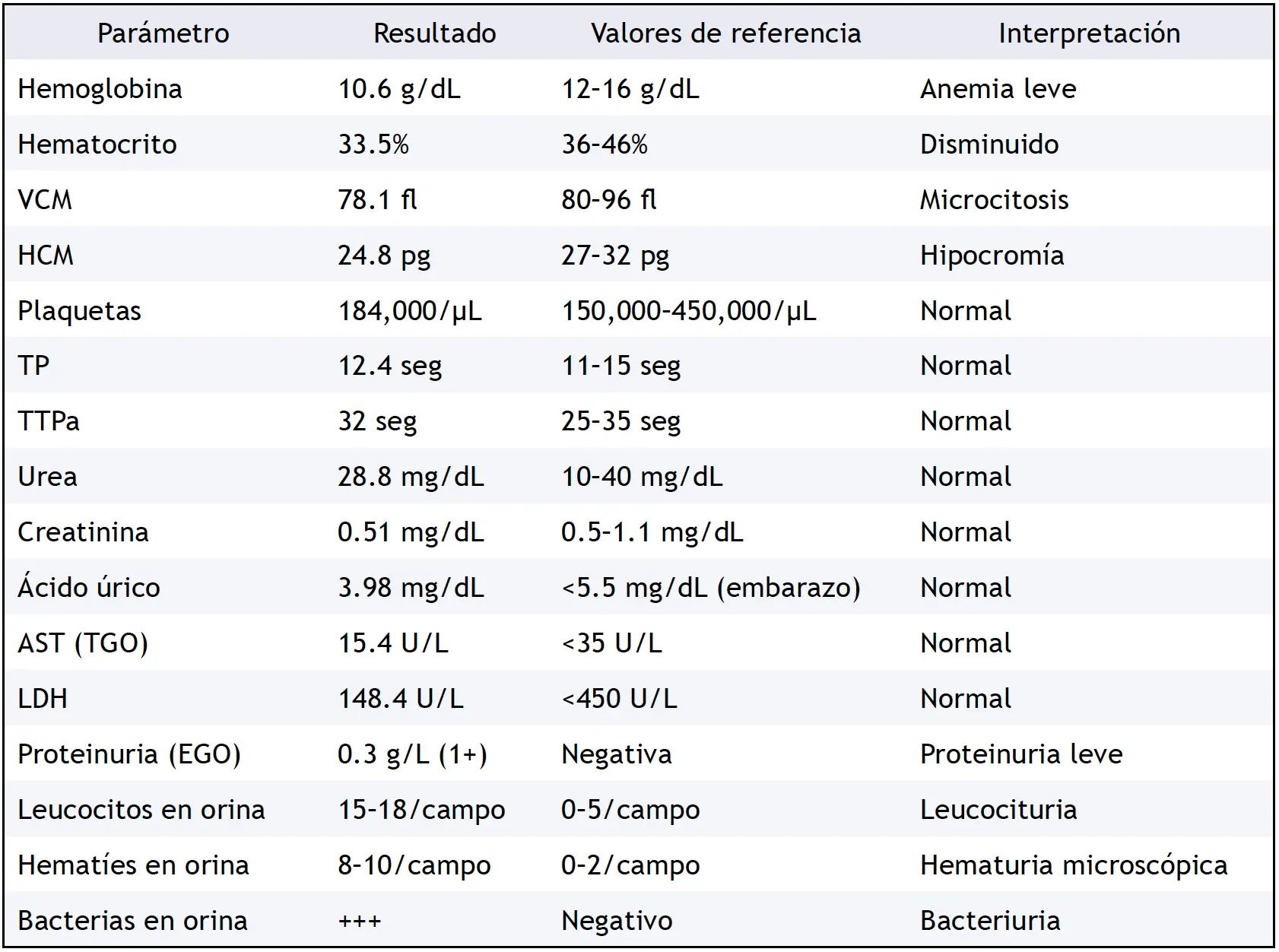 Laboratorios realizados: Al ingreso, se solicitaron exámenes de laboratorio completos con el fin de descartar complicaciones asociadas a hipertensión en el embarazo. La biometría hemática reveló anemia microcítica hipocrómica moderada (Hb 10.6 g/dL, Hto 33.5%, VCM 78.1 fl, HCM 24.8 pg), sin trombocitopenia (plaquetas 184,000/µL). Los estudios de coagulación mostraron tiempos dentro de rangos normales. En la bioquímica, la función renal se encontraba conservada (urea 28.8 mg/dL, creatinina 0.51 mg/dL), sin hiperuricemia (ácido úrico 3.98 mg/dL). Las pruebas hepáticas (AST 15.4 U/L, bilirrubinas y LDH normales) no evidenciaron compromiso hepático ni hemólisis, descartando síndrome de HELLP. El uroanálisis reportó proteinuria leve (0.3 g/L, equivalente a 1+ en tira reactiva), leucocituria (15–18/campo) y bacteriuria (+++), hallazgo de infección urinaria concomitante. En conjunto, los resultados no cumplen criterios de preeclampsia severa, eclampsia ni HELLP, aunque se confirma hipertensión crónica con hipertensión gestacional sobreañadida y se recomienda vigilancia estricta durante el trabajo de parto.