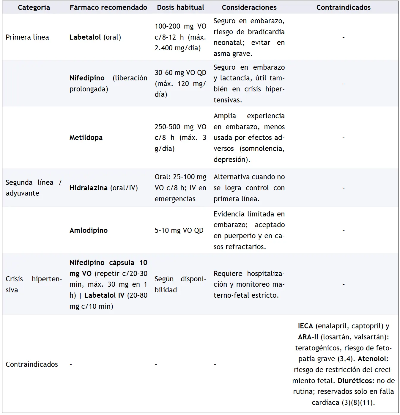 Objetivo de PA en embarazo: mantener cifras entre 120–160/80–105 mmHg. Tras el estudio CHAP, se recomienda iniciar o intensificar tratamiento en ≥140/90 mmHg, sin esperar a 160/110 mmHg. En puerperio, nifedipino, labetalol y metildopa son seguros en lactancia; amlodipino puede considerarse como alternativa en hipertensión resistente (12).