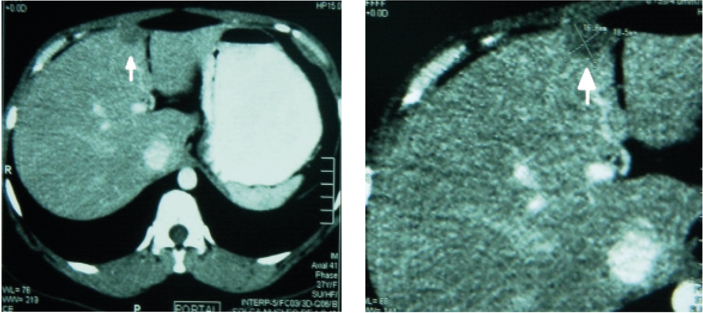 Figura 1. Se aprecia la lesión hepática en tamaño normal y ampliado.