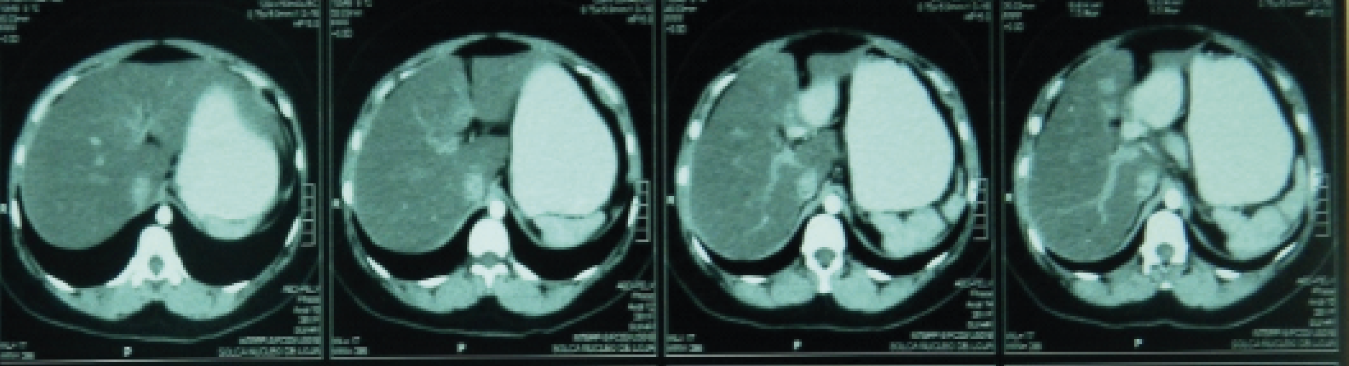 Se realizan estudios de extensión, donde se identifican estructuras internas normales en la tomografía de tórax, en el encéfalo y en el esqueleto. En la tomografía de abdomen, se detecta hígado de densidad heterogénea por presencia de imagen hipodensa de forma redondeada, con bordes definidos de 18.5 mm con 25 UH, que incrementa su densidad con el medio de contraste a 65 UH.