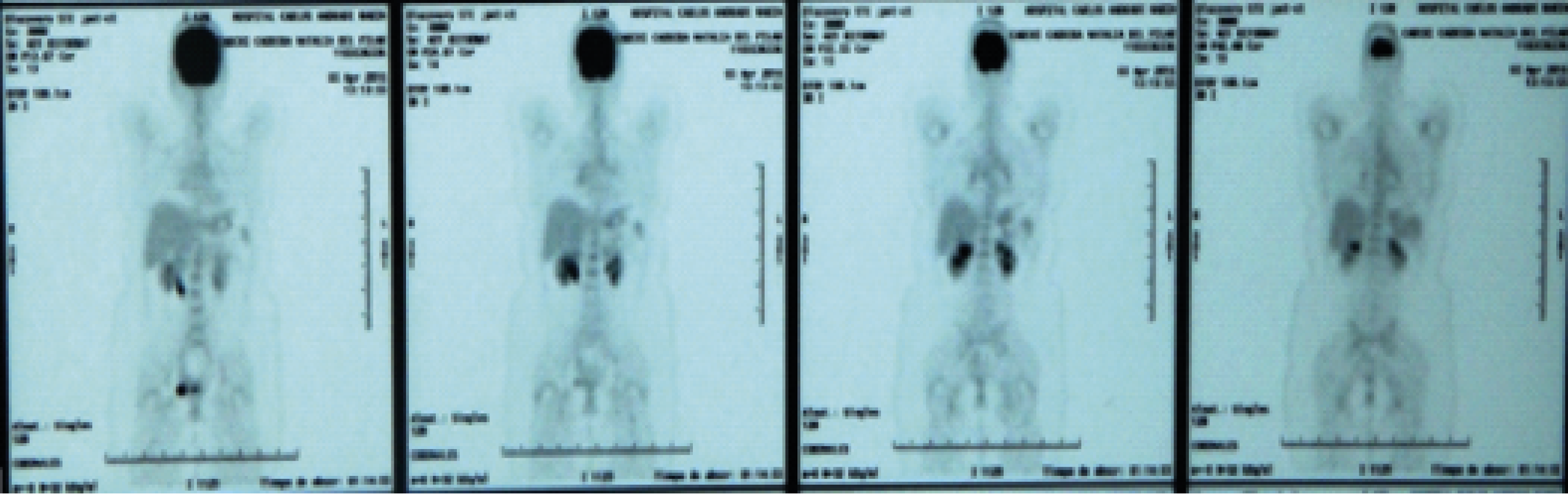 Una evaluación adicional realizada en abril de 2016 con PET no muestra actividad tumoral metabólica a nivel hepático y tampoco se evidencia actividad tumoral en ninguna otra parte del organismo confirmando la presencia de remisión completa metabólica en la paciente, como se aprecia en las imágenes.